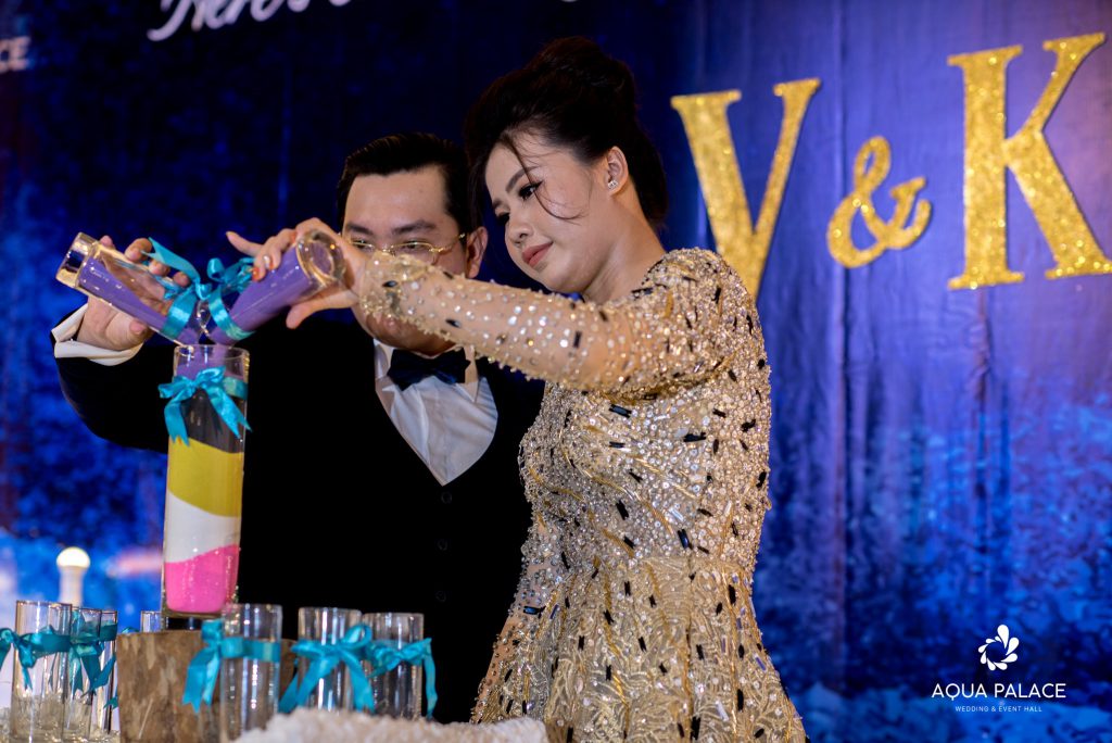 Khoảnh khắc anh Vũ và chị Kim nắm tay nhau tiến vào lễ đường là giây phút thiêng liêng nhất cuộc đời anh chị. Từ nay, hai người gọi nhau là “người bạn đời suy nhất”. Cặp đôi cùng thực hiện nghi thức sáng tạo chỉ có trong lễ cưới độc nhất tại Aqua Palace như cắt bắt kem, rót rượu sâm panh, rót cát hợp hôn. Rượu tượng trưng cho lửa tình nồng đượm, say mê; cát được sử dụng gồm 5 màu sắc hồng, trắng, vàng, đen, tím lần lượt mang ý nghĩa: ngọt ngào, tin tưởng, chân thành, nhường nhịn, thủy chung.