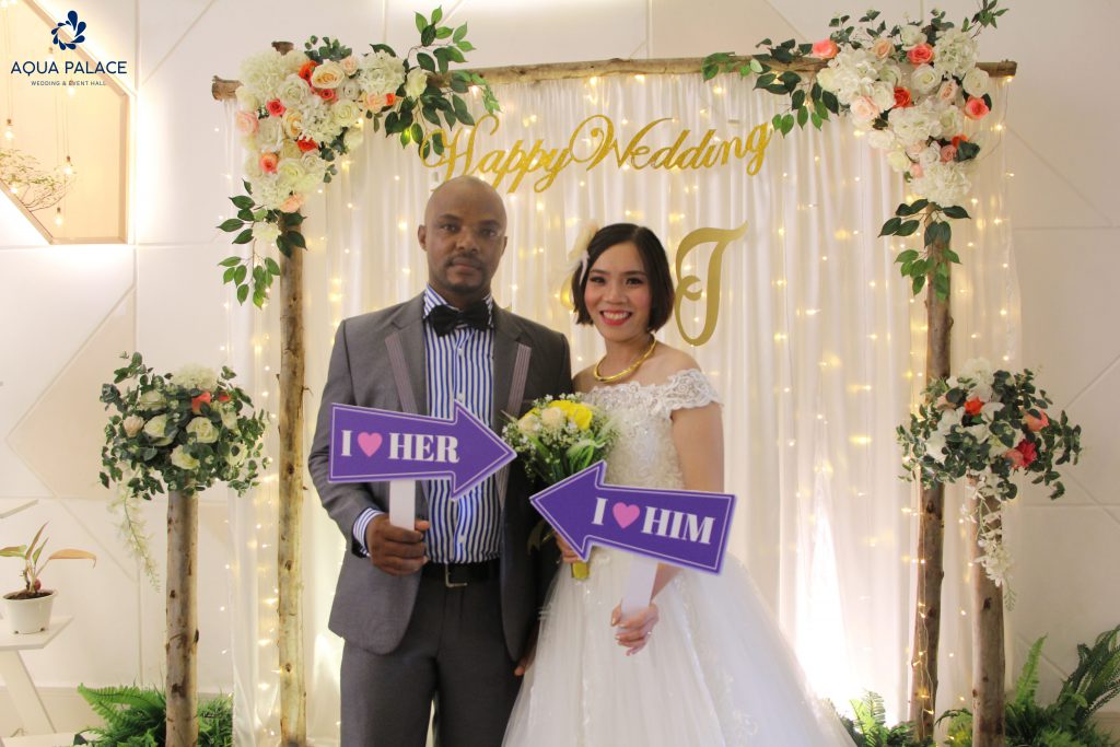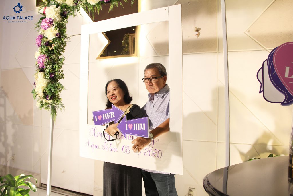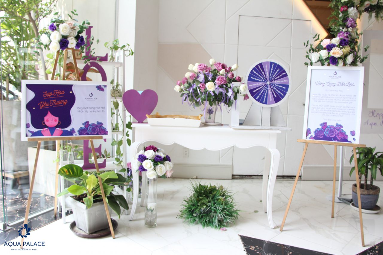 Ngay tại cửa chính, bao trùm một khoảng không gian là sắc tím mộng mơ thu hút ánh nhìn của mọi vị khách đến dự tiệc. Aqua Palace lựa chọn tone màu này bởi sự nhẹ nhàng, lãng mạn mà không kém phần quý phái như tượng trưng cho vẻ đẹp của phái nữ. Nổi bật vào ban ngày và lung linh vào ban đêm chính không chỉ diễn tả vẻ đẹp của SẠP HOA YÊU THƯƠNG mà còn là lời chúc Aqua Palace muốn gửi đến ‘’ nửa kia của thế giới’’.